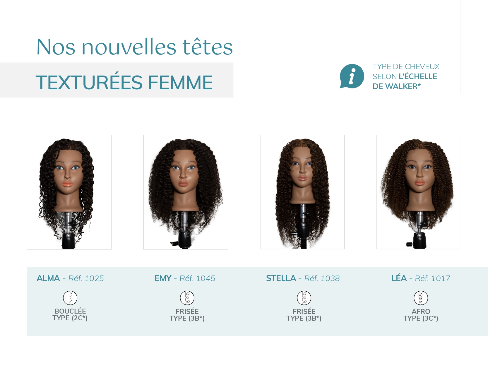 Découvrez notre sélection de têtes à coiffer professionnelles avec cheveux texturés, spécialement conçues pour vous entraîner aux techniques de coupe, de soin et de coiffage sur cheveux bouclés, ondulés ou crépus. Exalto Professionnel vous propose 6 modèles différents, adaptés aux besoins des formations en coiffure ethnique et texturée.
